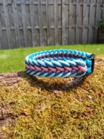 Deze unieke halsband is van sterk nylon koord geknoopt en heeft een mooi glanzende D-ring waar je een riem aan kunt bevestigen. Deze halsband heeft een goede kwaliteit plastic sluiting.